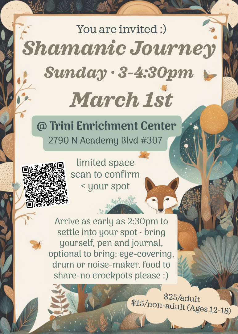 Shamanic Journey Sunday, March 1, 2026 3:00 PM 4:30 PM Trini Enrichment Center 2790 North Academy Boulevard Colorado Springs, CO, 80917 United States (map) Google Calendar ICS BOOK your spot by clicking on the flyer above^ If pricing is inaccessible, email: [email protected]