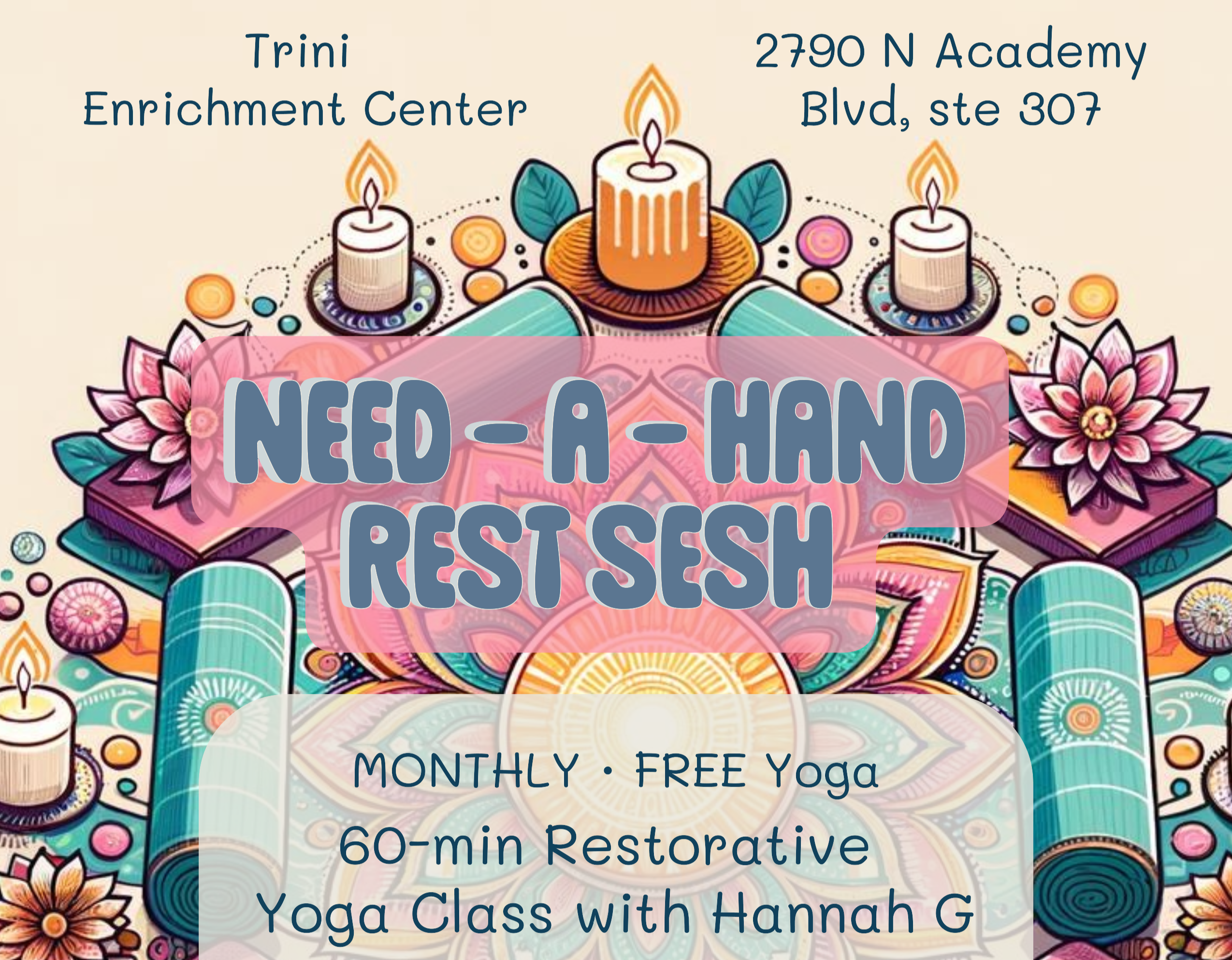 Back to All Events Need-a-Hand Rest Sesh Friday, May 29, 2026 6:00 PM 7:00 PM Trini Enrichment Center 2790 North Academy Boulevard Colorado Springs, CO, 80917 United States (map) Google Calendar ICS Click the flyer above^ to book your spot :) Free monthly offering of Restorative Yoga from Hannah G, Harmony GuideDonations-acceptedSupported, on-the-ground therapeutic practice